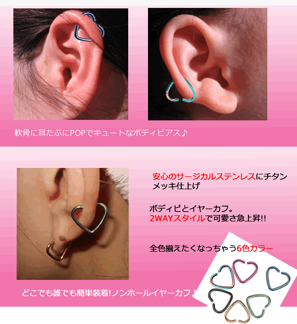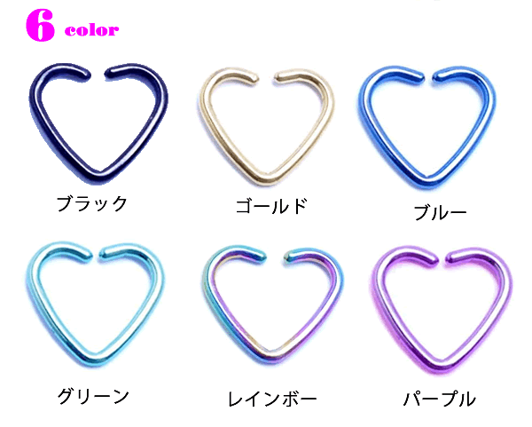 ハート型のステンレスイヤリングをカラーチタンメッキした可愛らしいシームレスリングです。